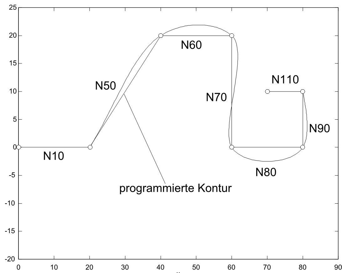 Das folgende NC-Programm liefert dasselbe Resultat, verwendet jedoch für die An- und Abwahl der Spline-Interpolation die zweite Variante.
