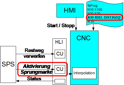 Die Sprungmarken können anschließend durch die SPS zur Laufzeit einzeln gültig geschaltet werden (ACTIVATION). Dies kann über die Control Unit „Restweg verwerfen, Ende-Marke“ erfolgen.
